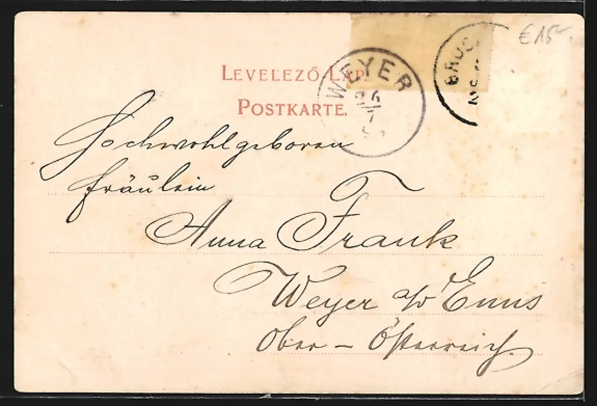 alte Ansichtskarte, gelaufen 1899, Briefmarke entfernt, rückseitig Oberflächenschaden, Eckknick li. unten, restaurierter Einriss li. oben, guter Zustand