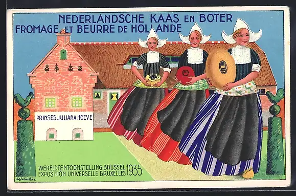 AK Brüssel, Exposition Universelle 1935, Fromage et Beurre de Hollande, Niederländerinnen mit Käselaib