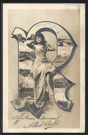 AK Buchstabe R mit junger Dame, Strand, Gebäude, Schiff