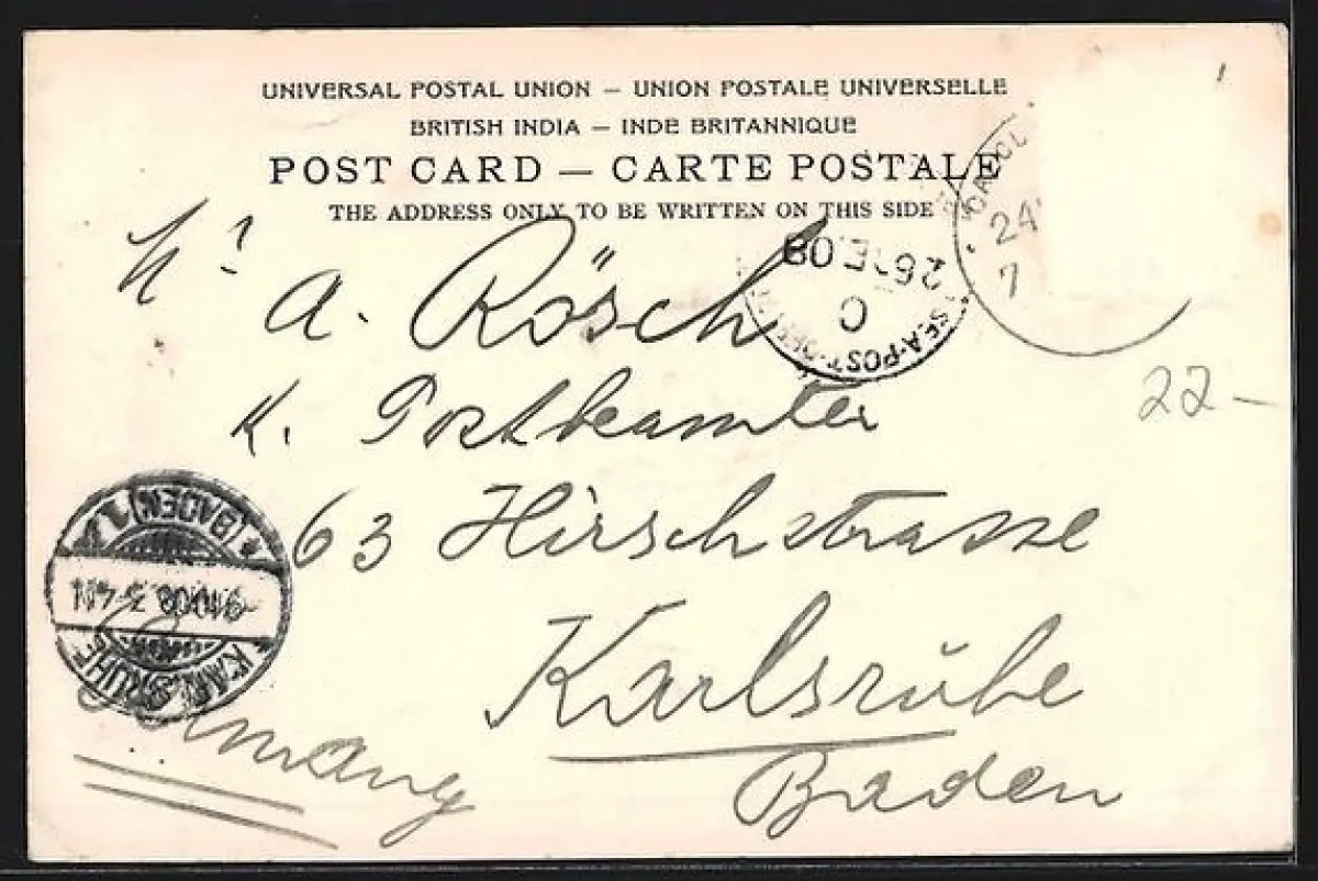 alte Ansichtskarte, gelaufen 1908, Briefmarke entfernt, rückseitig Oberflächenschaden, guter Zustand