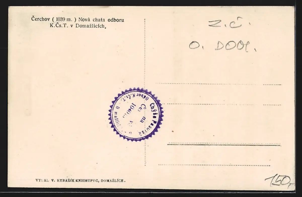 Personenbezogene Daten auf der Rückseite der Karte wurden durch blauen Textmarker unkenntlich gemacht. Die blauen Stellen sind auf die Vorderseite durchgeweicht und wirken sich negativ auf das Postkartenfoto aus