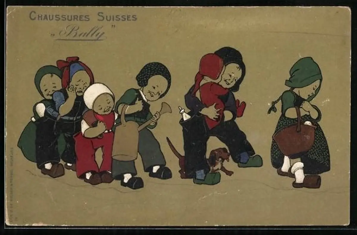 AK Chaussures Suisses, Bally, Kinder in Erwachsenenkleidung stehen Schlange