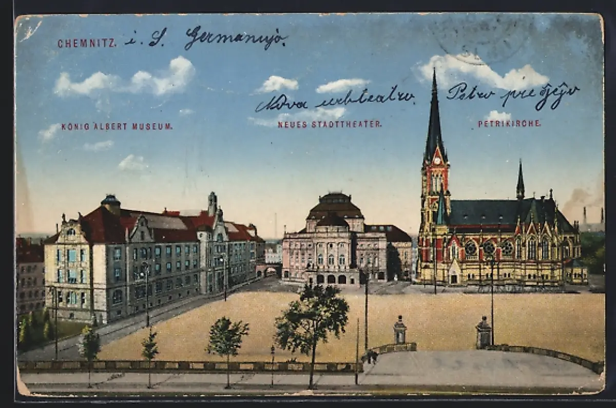 AK Chemnitz, König Albert Museum, Stadttheater und Petrikirche