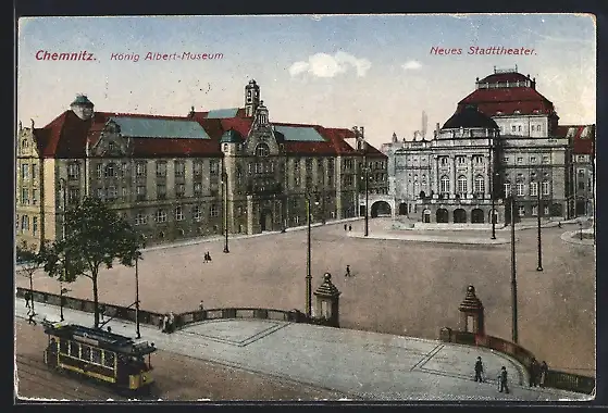 AK Chemnitz, Neues Stadttheater und König Albert-Museum mit Strassenbahn
