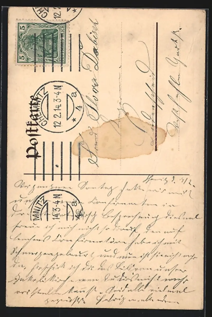 Personenbezogene Daten auf der Rückseite der Karte wurden durch blauen Textmarker unkenntlich gemacht. Die blauen Stellen sind auf die Vorderseite durchgeweicht und wirken sich negativ auf das Postkartenfoto aus