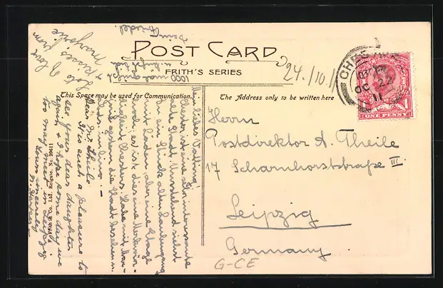 Personenbezogene Daten auf der Rückseite der Karte wurden durch blauen Textmarker unkenntlich gemacht. Die blauen Stellen sind auf die Vorderseite durchgeweicht und wirken sich negativ auf das Postkartenfoto aus