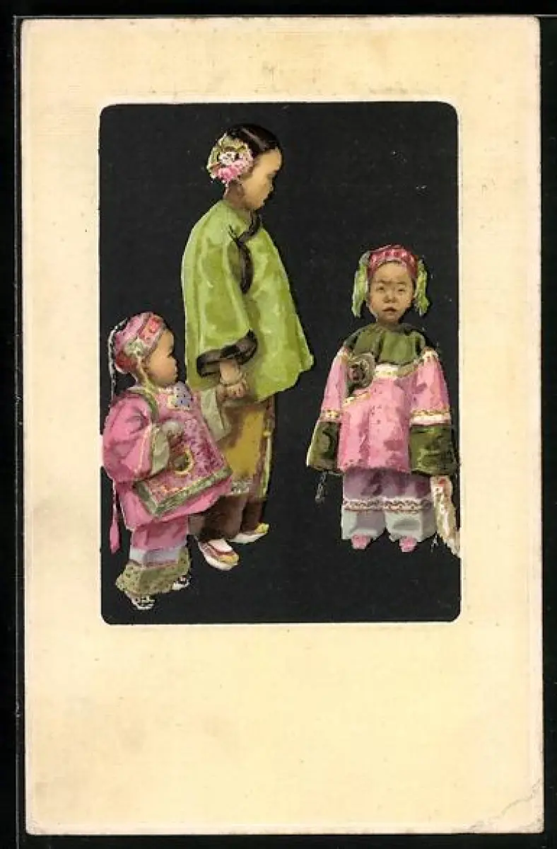AK China, drei kleine chinesische Mädchen in prächtigen Gewändern