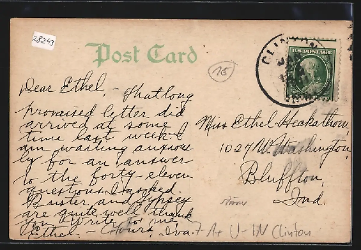 Personenbezogene Daten auf der Rückseite der Karte wurden durch blauen Textmarker unkenntlich gemacht. Die blauen Stellen sind auf die Vorderseite durchgeweicht und wirken sich negativ auf das Postkartenfoto aus