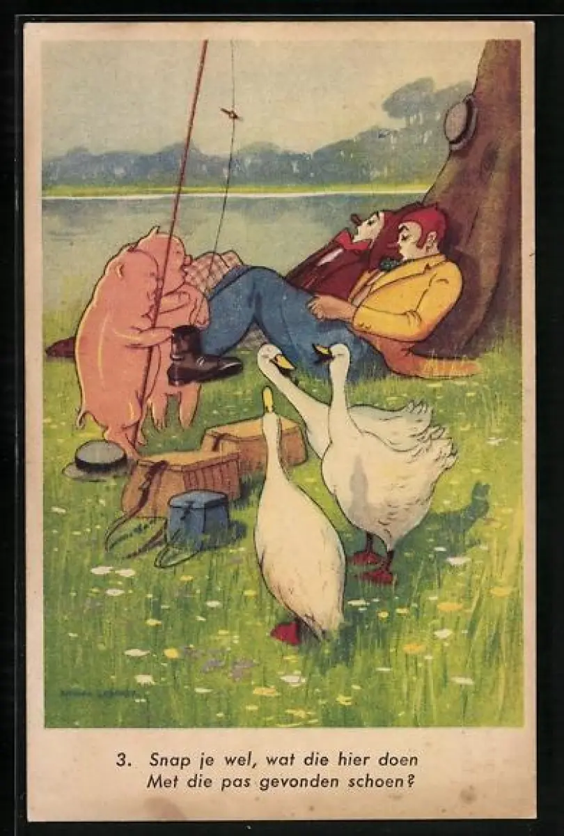 AK Clowns mit Schweinen und Gänsen als Angler mit geangeltem Schuh