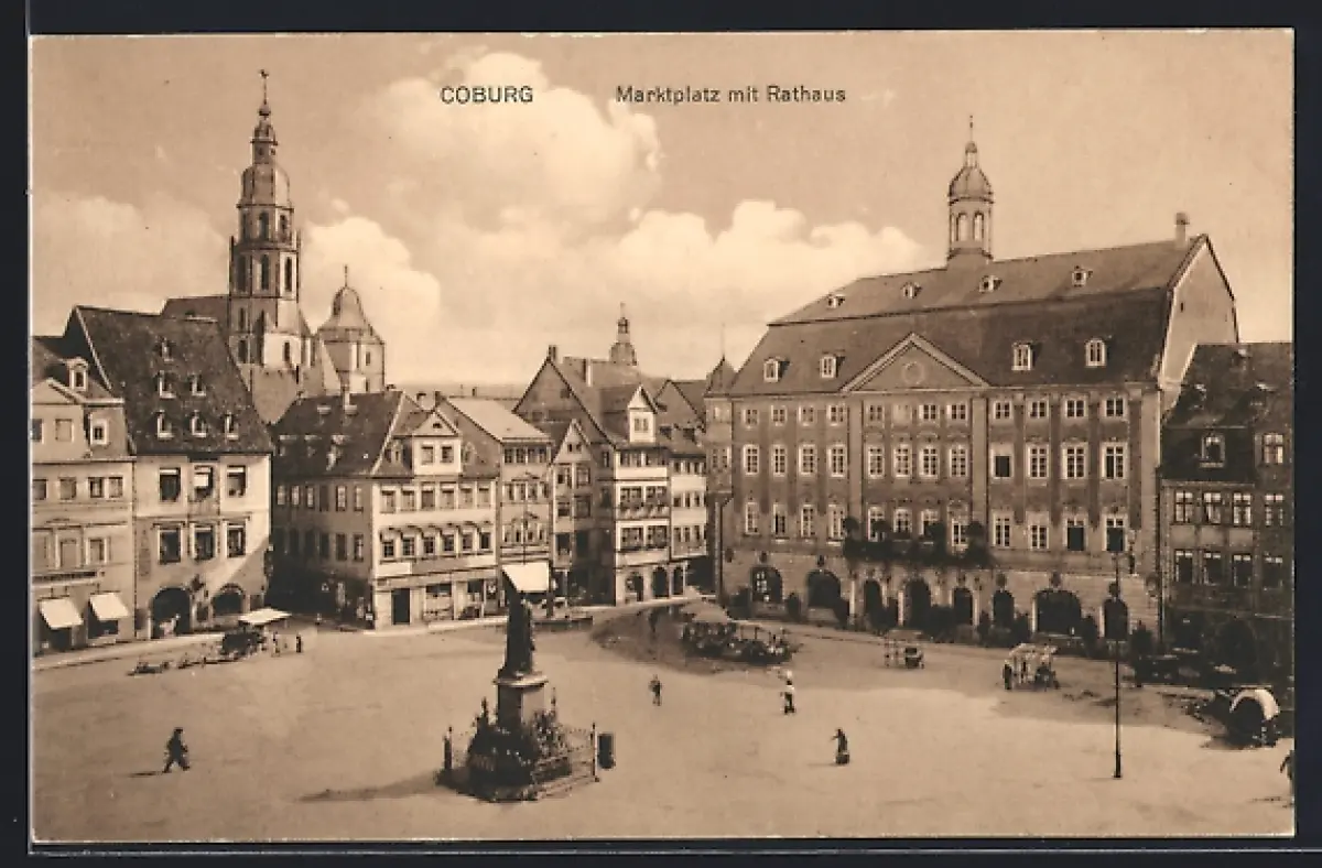 AK Coburg, Marktplatz mit Denkmal und Rathaus