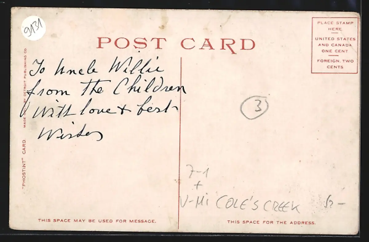 Personenbezogene Daten auf der Rückseite der Karte wurden durch blauen Textmarker unkenntlich gemacht. Die blauen Stellen sind auf die Vorderseite durchgeweicht und wirken sich negativ auf das Postkartenfoto aus