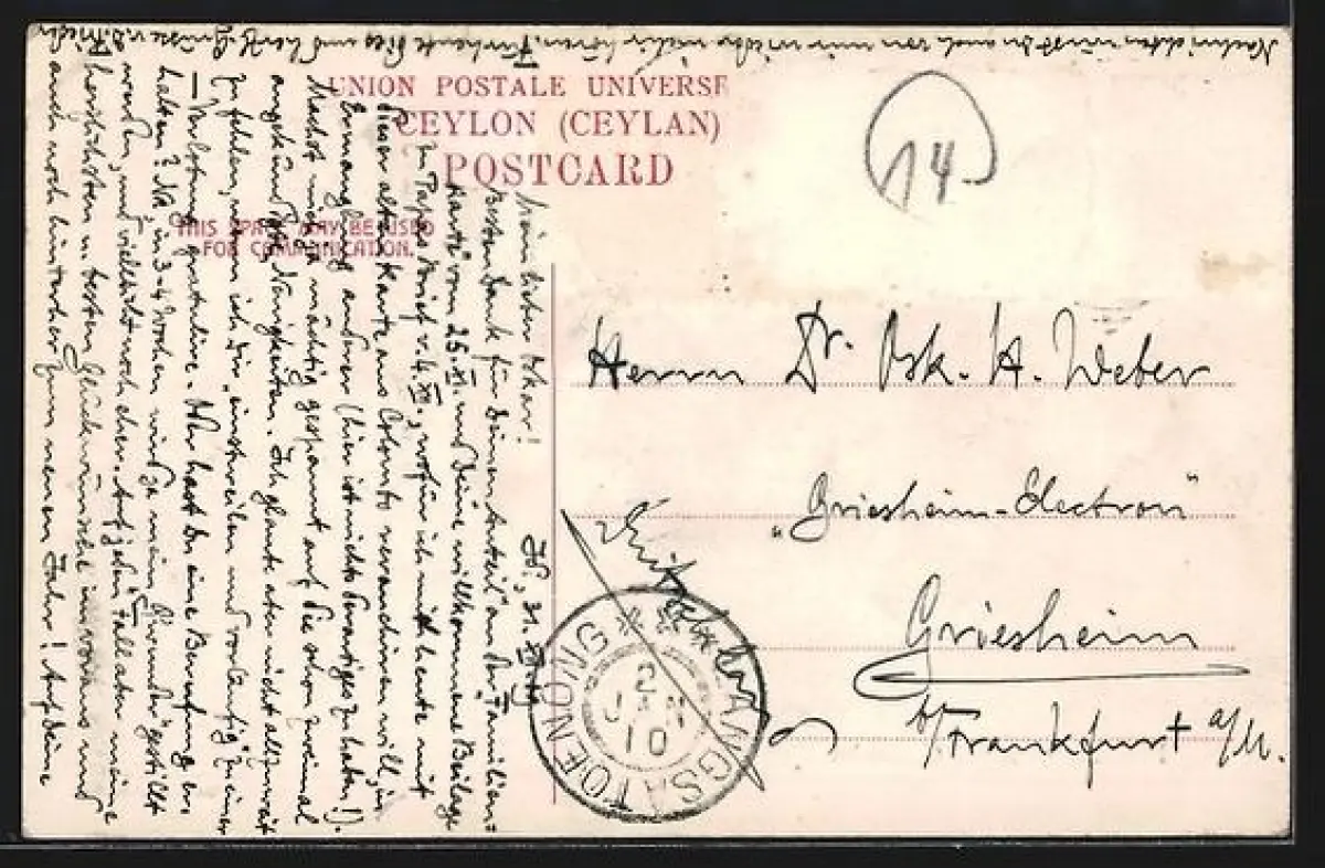 gelaufen 1910, Briefmarke entfernt, rückseitig Oberflächenschaden, Eckknick re. oben, Bugspur li. oben, guter Zustand