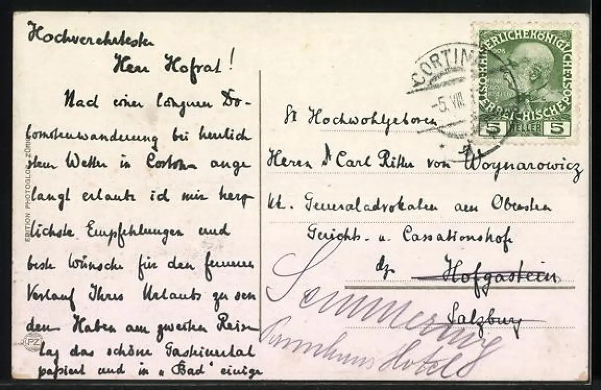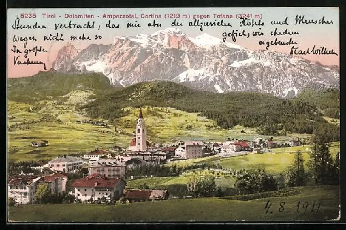 AK Cortina d`Ampezzo, Ortsansicht aus der Vogelschau gegen den Tofana