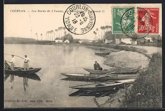AK Courlon, Les Bords de l`Yonne, bateaux et rameurs sur la rive