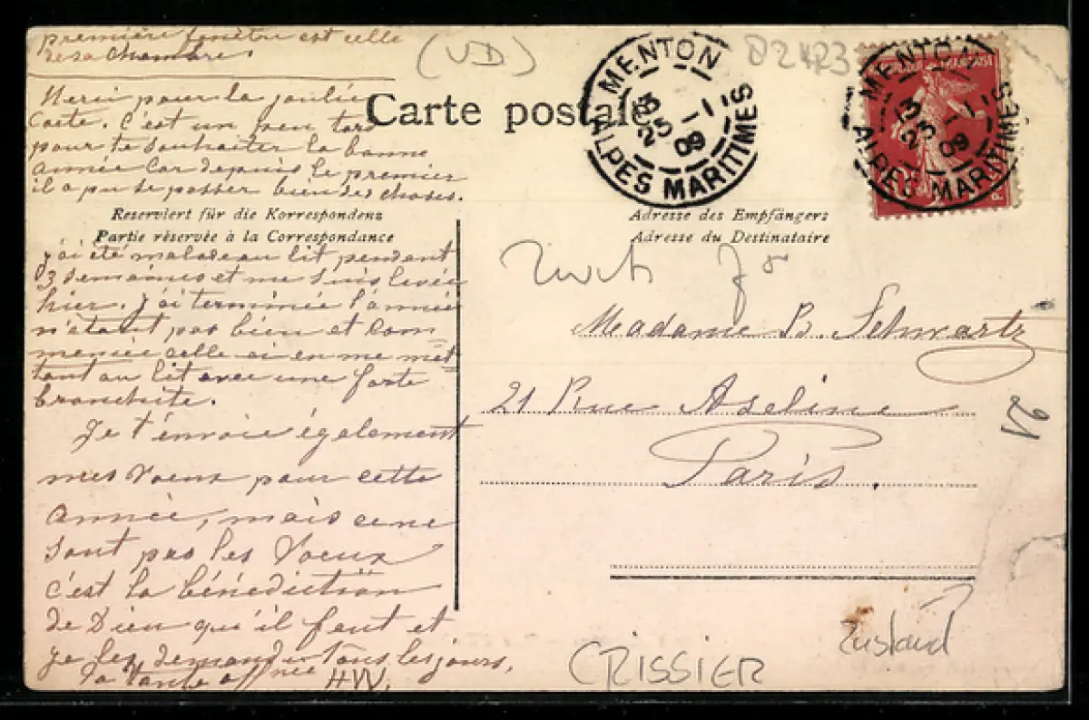 gelaufen 1909, Eckknicke li., Ecken bestoßen, Klebe- und Papierrest unten li., Stempelspur, guter Zustand