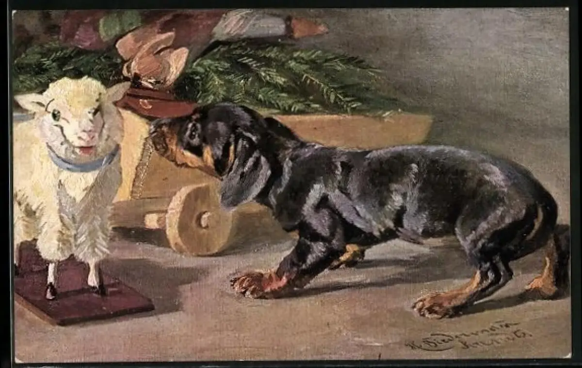AK Dackel greift ein Spielzeug-Schaf an