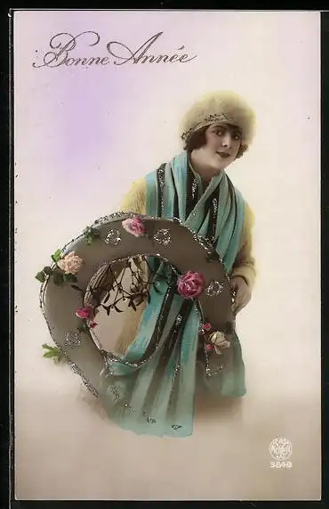 AK Dame mit Hufeisen und Mistelzweig, Bonne Année