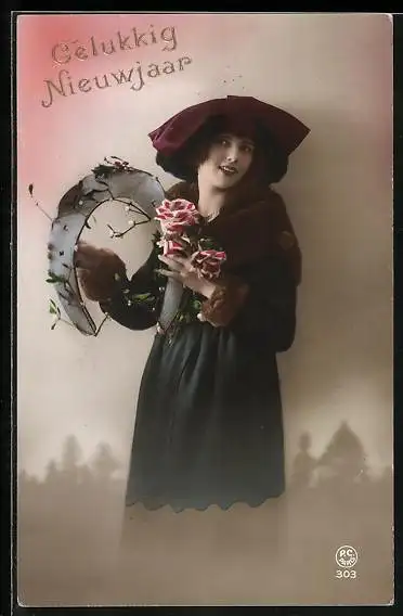 AK Dame mit Hufeisen und Mistelzweig, Gelukkig Nieuwjaar