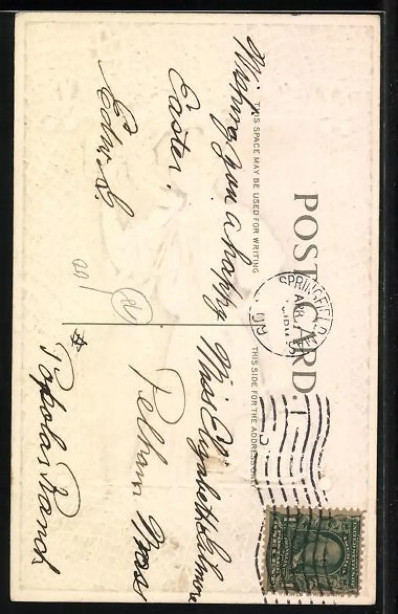 Personenbezogene Daten auf der Rückseite der Karte wurden durch blauen Textmarker unkenntlich gemacht. Die blauen Stellen sind auf die Vorderseite durchgeweicht und wirken sich negativ auf das Postkartenfoto aus