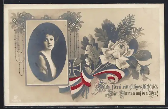 AK Damenportrait mit Eisernem Kreuz und patriotischer Schleife