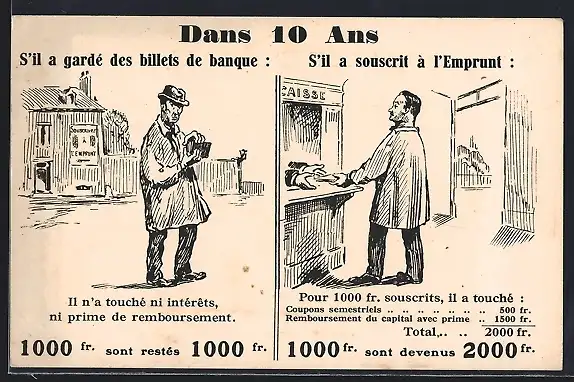 AK Dans 10 Ans, S`il a gardé des billets de banque, S`il a souscrit à l`Emprunt, Mann bringt sein Geld zur Bank