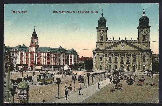 AK Debrecen-Debreczin, Ref. nagytempiom es püspöki palota, Strassenbahn, Litfasssäule