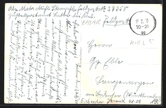 Personenbezogene Daten auf der Rückseite der Karte wurden durch blauen Textmarker unkenntlich gemacht. Die blauen Stellen sind auf die Vorderseite durchgeweicht und wirken sich negativ auf das Postkartenfoto aus