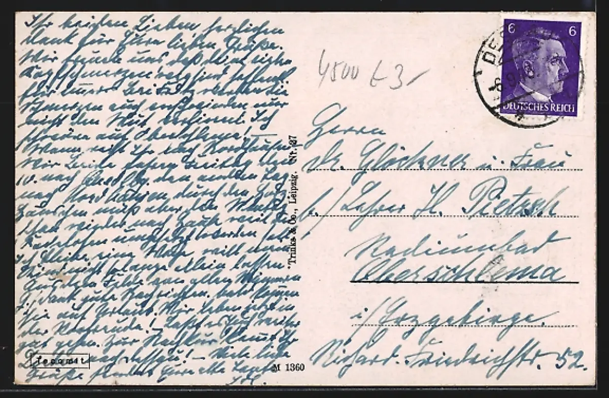 Personenbezogene Daten auf der Rückseite der Karte wurden durch blauen Textmarker unkenntlich gemacht. Die blauen Stellen sind auf die Vorderseite durchgeweicht und wirken sich negativ auf das Postkartenfoto aus
