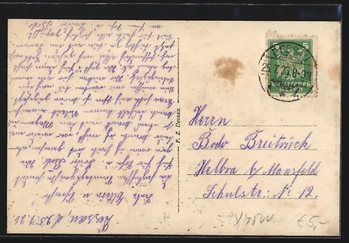 Personenbezogene Daten auf der Rückseite der Karte wurden durch blauen Textmarker unkenntlich gemacht. Die blauen Stellen sind auf die Vorderseite durchgeweicht und wirken sich negativ auf das Postkartenfoto aus