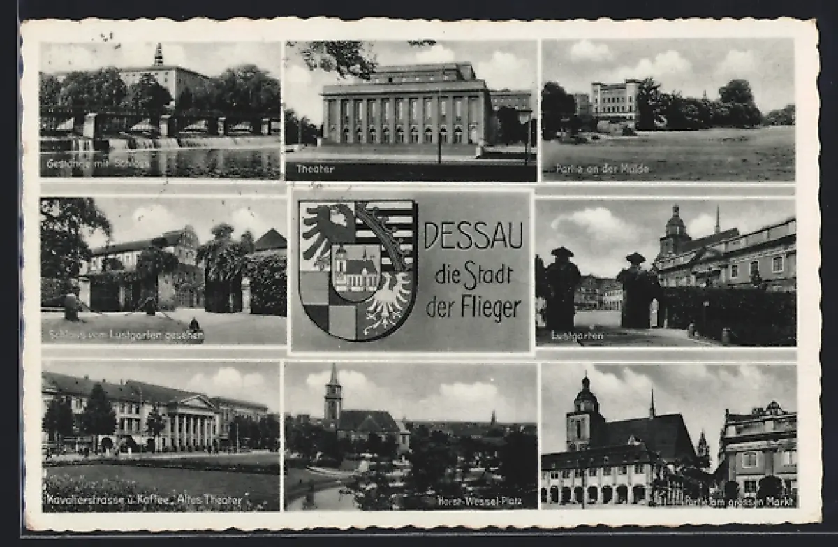 AK Dessau, Theater, Schloss, Kavalierstrasse u. Kaffee Altes Theater, Wappen