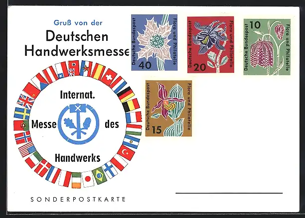 AK Deutsche Handwerksmesse, Logo und Nationalflaggen, Sonderbriefmarken