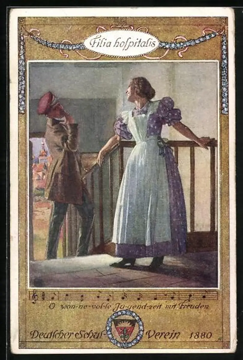 AK Deutscher Schulverein NR. 17: Student verabschiedet sich von einer jungen Frau im Treppenhaus