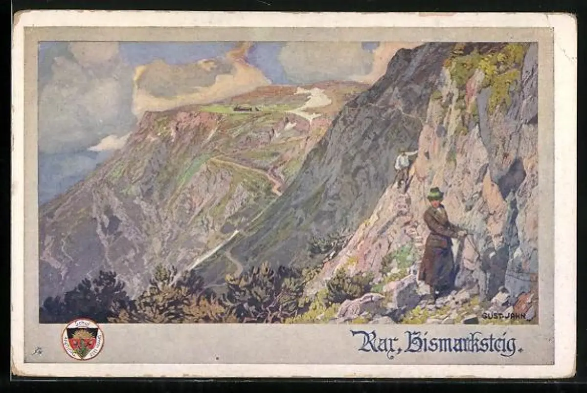 AK Deutscher Schulverein NR. 520: Gust. Jahn: Rax, Bismarcksteig, Bergwanderer am Steilhang