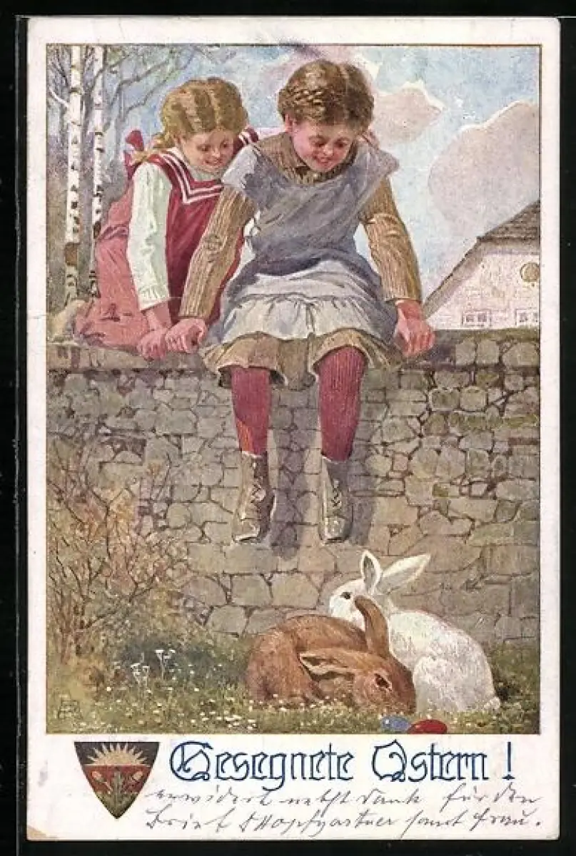 AK Deutscher Schulverein Nr. 870: Gesegnete Ostern, Mädchen auf der Mauer und Osterhasen