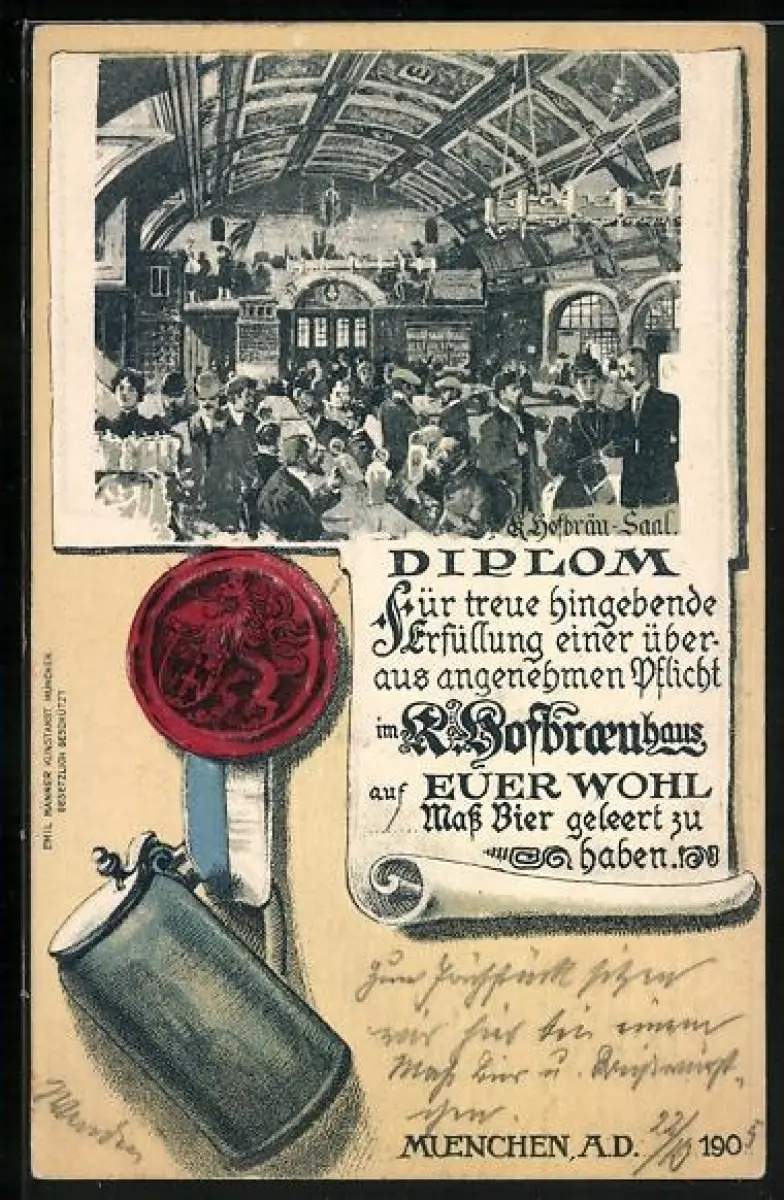 AK Diplom Münchner Hofbräuhaus mit Siegel und Bierkrug