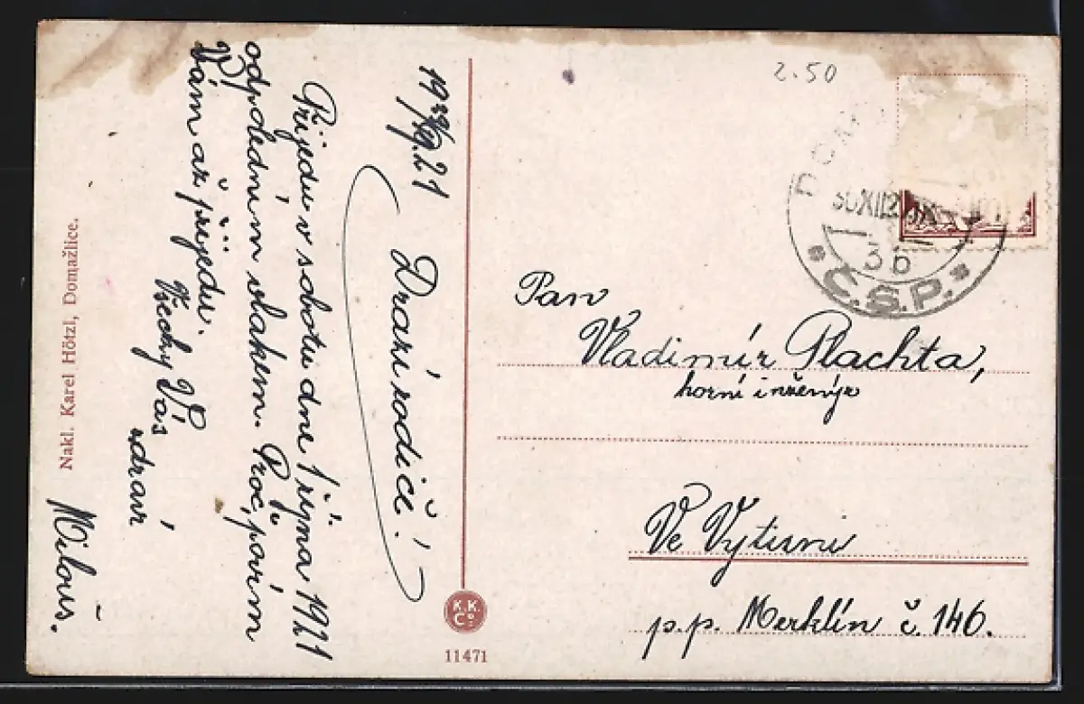 Personenbezogene Daten auf der Rückseite der Karte wurden durch blauen Textmarker unkenntlich gemacht. Die blauen Stellen sind auf die Vorderseite durchgeweicht und wirken sich negativ auf das Postkartenfoto aus