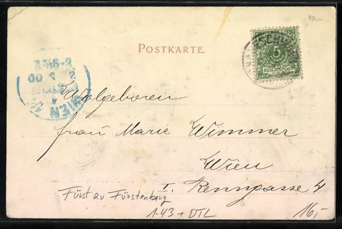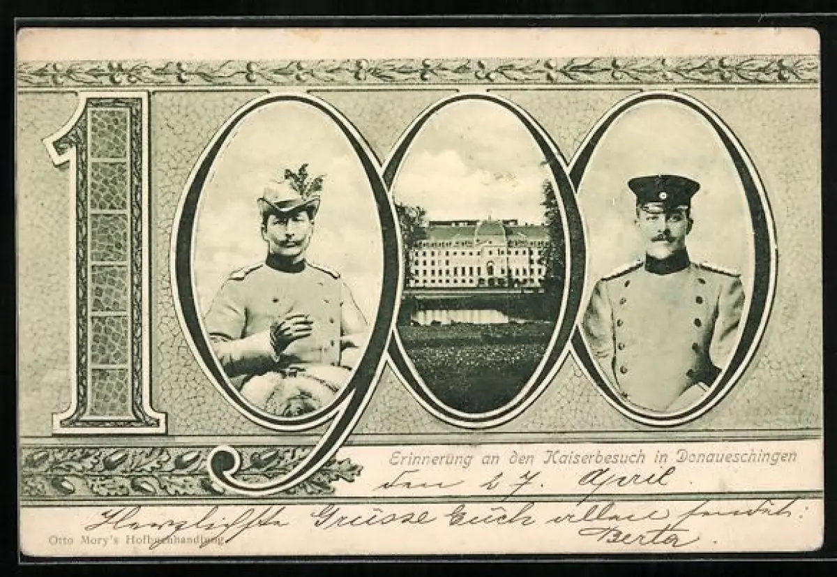 AK Donaueschingen, Kaiserbesuch 1900, Fürst zu Fürstenberg und Kaiser Wilhelm II. im Jahreszahl-Passepartout
