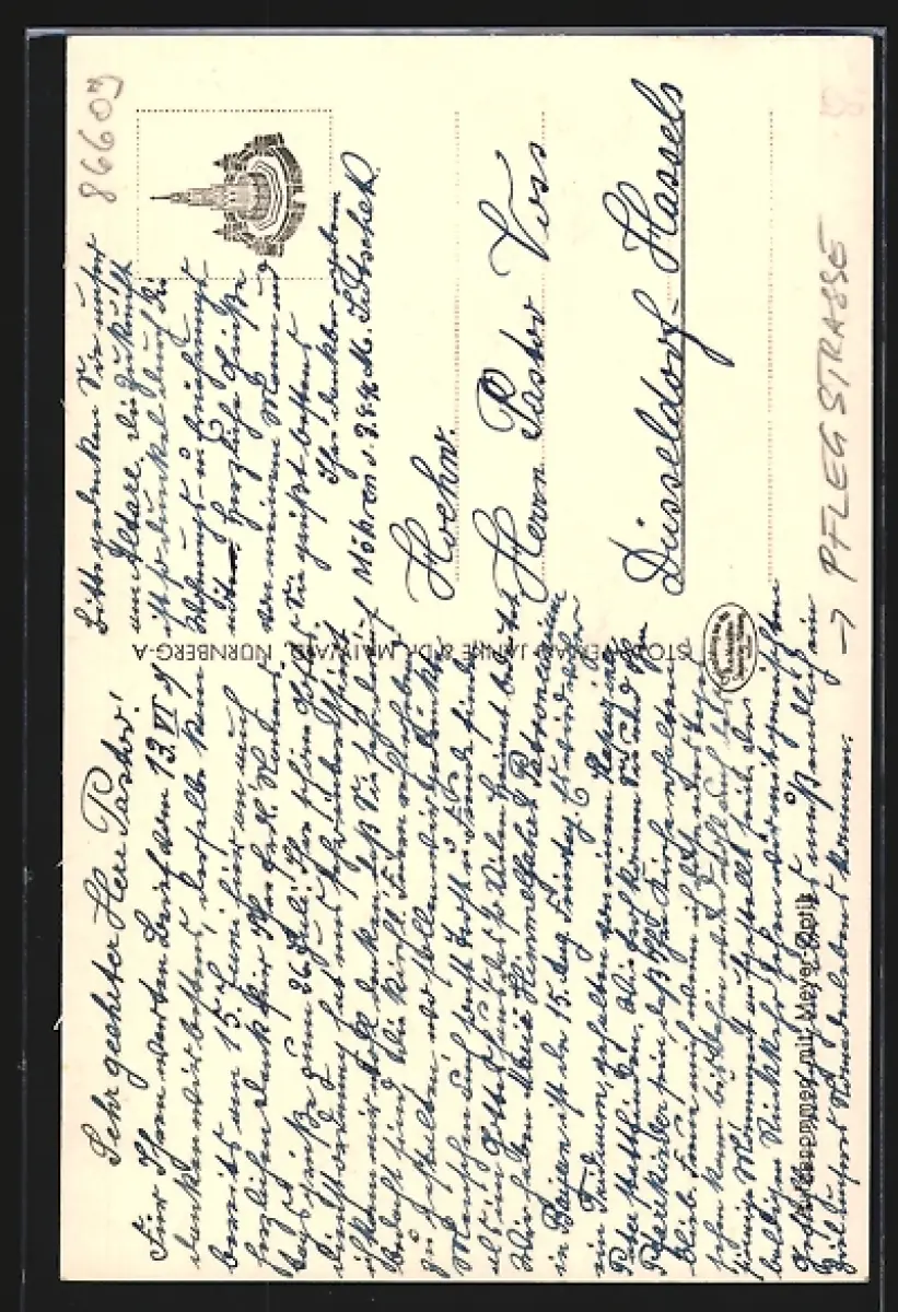 Personenbezogene Daten auf der Rückseite der Karte wurden durch blauen Textmarker unkenntlich gemacht. Die blauen Stellen sind auf die Vorderseite durchgeweicht und wirken sich negativ auf das Postkartenfoto aus