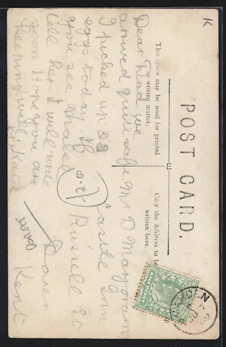 Personenbezogene Daten auf der Rückseite der Karte wurden durch blauen Textmarker unkenntlich gemacht. Die blauen Stellen sind auf die Vorderseite durchgeweicht und wirken sich negativ auf das Postkartenfoto aus
