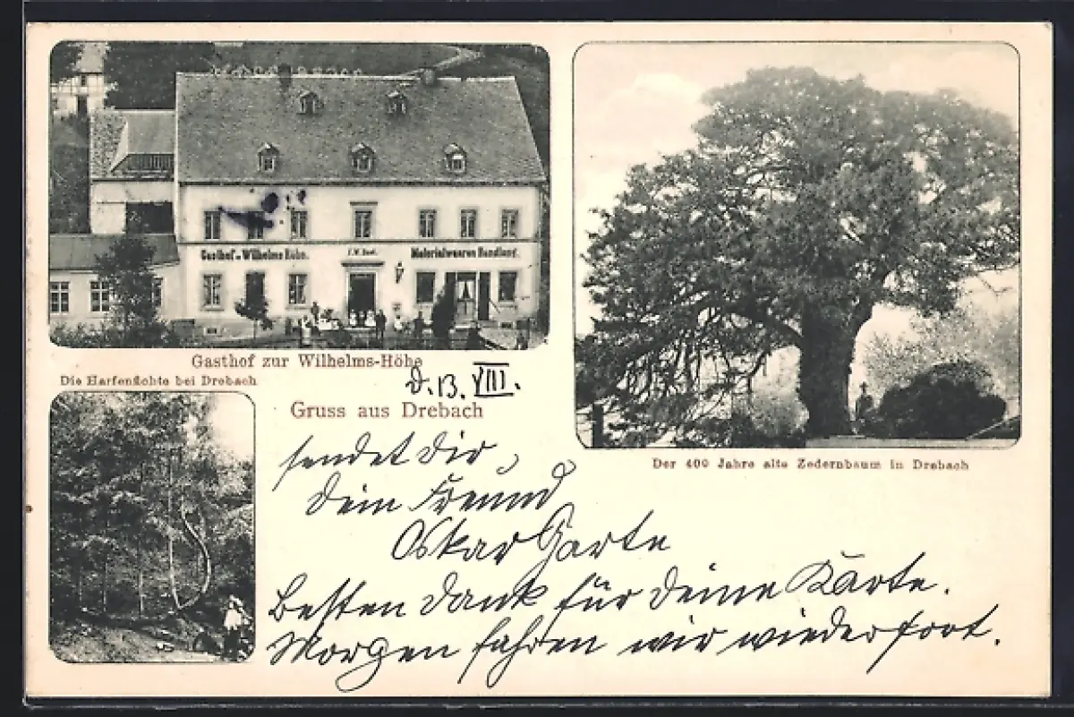 AK Drebach, Gasthof zur Wilhelms-Höhe, 400 Jahre alte Zedernbaum, Harfenfichte