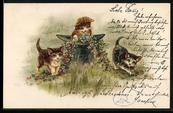 AK Drei Kätzchen mit Zylinderhut und Blumengirlande
