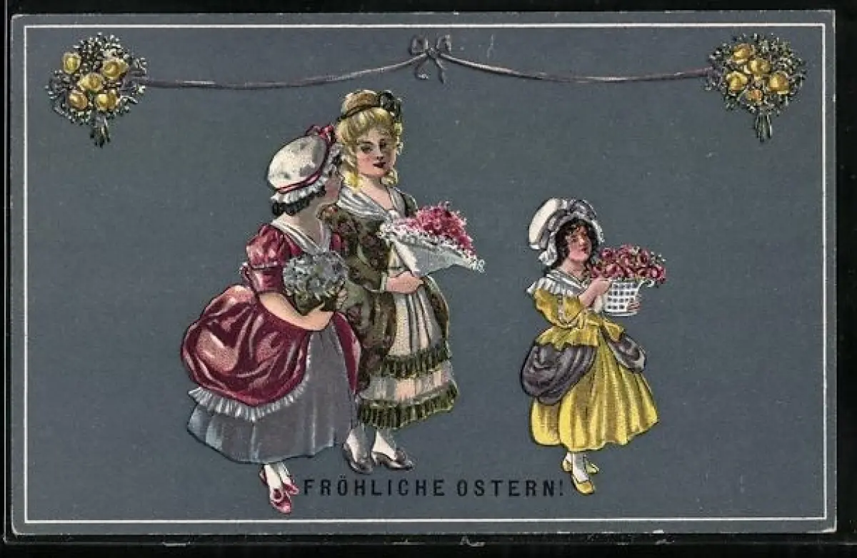 AK Drei Mädchen in hübschen Kleidern halten Blumensträusse in der Hand, Ostern
