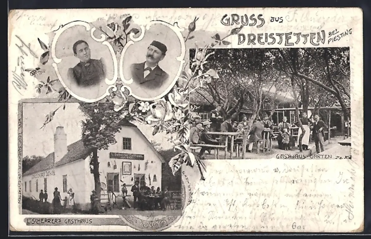 AK Dreistetten, L. Scherrer`s Gasthaus, Aussenansicht & Garten