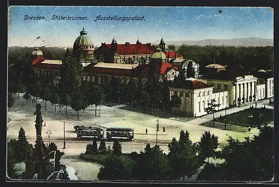 AK Dresden, Ausstellungspalast, Stübelbrunnen, Strassenbahn