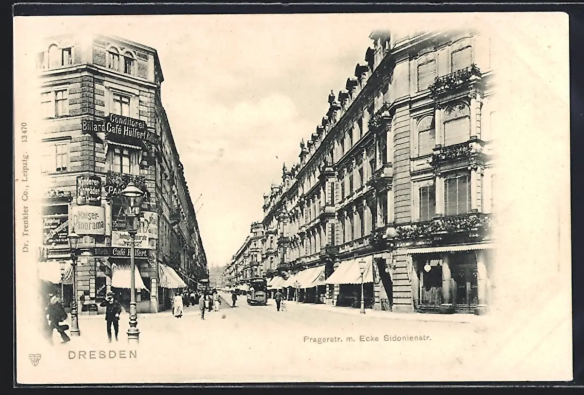 AK Dresden, Conditorei-Café Hülfert, Pragerstrasse Ecke Sidonienstrasse, Strassenbahn