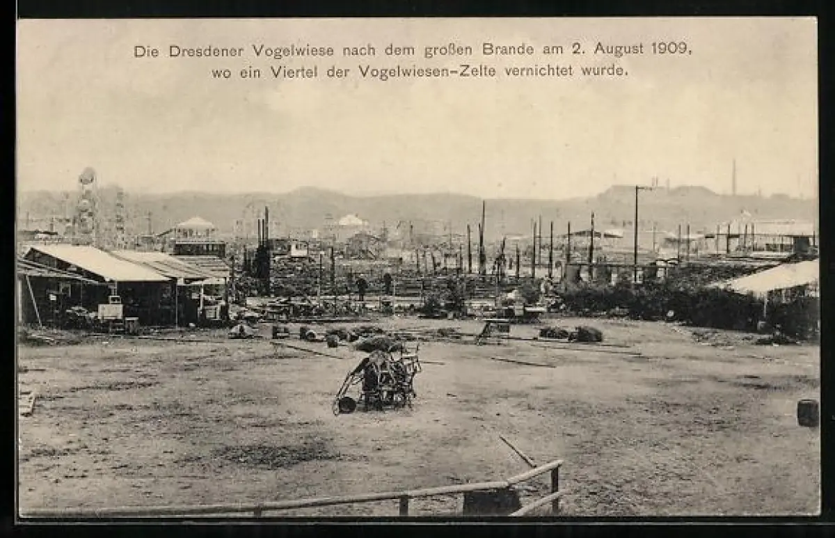 AK Dresden, Dresdner Vogelwiese nach dem Brande 1909 wo ein Veirtel der Vogelwiesen-Zelte vernichtet wurde