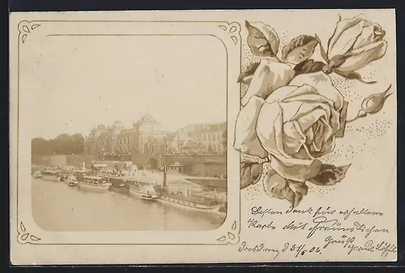 AK Dresden, Flusspartie mit Dampfern, Passepartout mit Rosen