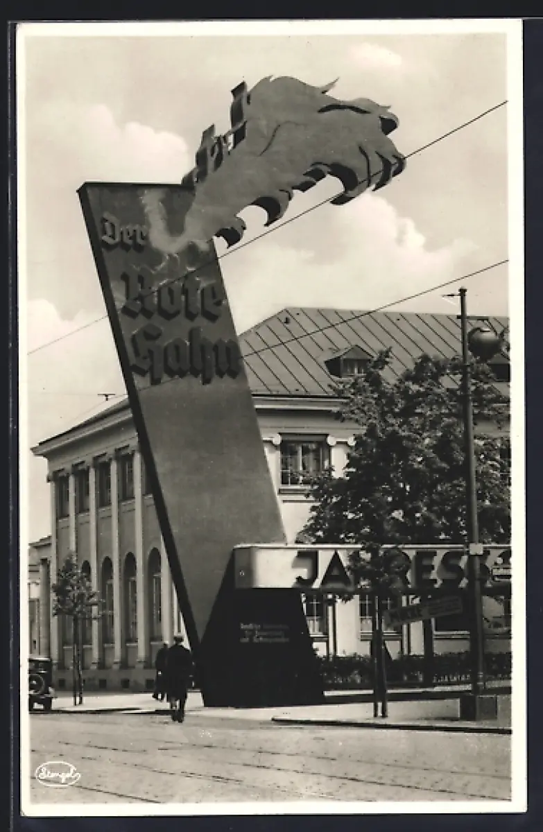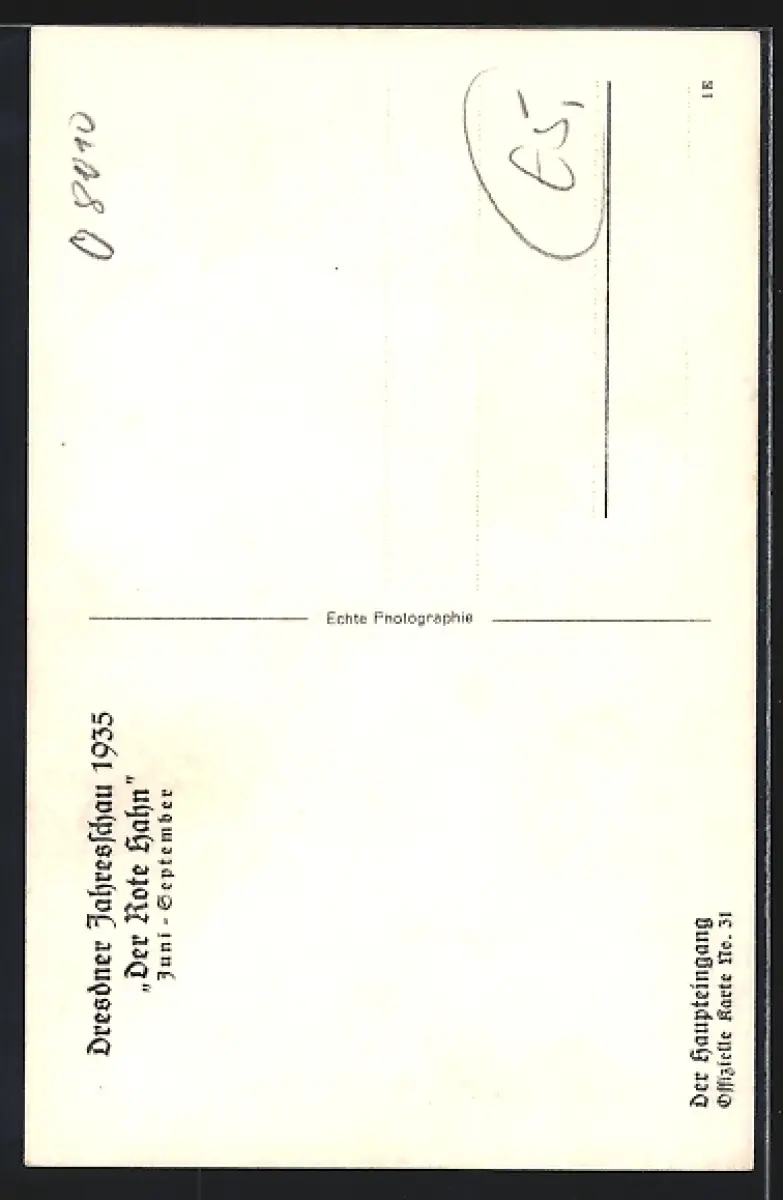 AK Dresden, Jahresschau 1935, Der Rote Hahn, Haupteingang mit Strasse