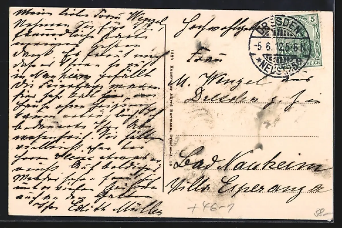 Personenbezogene Daten auf der Rückseite der Karte wurden durch blauen Textmarker unkenntlich gemacht. Die blauen Stellen sind auf die Vorderseite durchgeweicht und wirken sich negativ auf das Postkartenfoto aus