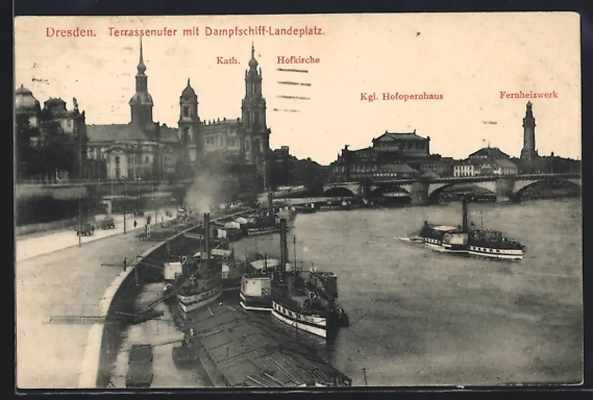 AK Dresden, Terrassenufer mit Dampfschiff-Landeplatz, Panorama mit Hofkirche, Kgl. Hofopernhaus und Fernheizwerk